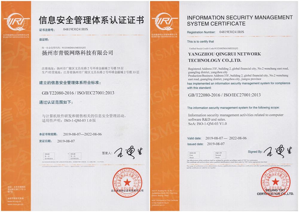 2019年08月21日熱烈祝賀揚州青銳通過ISO27001信息安全體系初次認證熱烈祝賀揚州青銳順利通過ISO27001信息安全體系初次認證,ISO27001作為目前被廣泛接納和采用的信息安全標準,它代表了信息安全管理的國際水準。此次認證,從揚州青銳目前所有的產(chǎn)品本身開始,追根至產(chǎn)品整體研發(fā)原始階段的安全管控,確認了青銳自身管理體系,已經(jīng)...