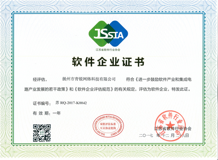 作為從事計算機軟件事業(yè)的公司,2017年揚州青銳也對自己的企業(yè)及軟件產品進行了認證,順利通過了“雙軟企業(yè)認證”,正式成為了“雙軟企業(yè)”。由江蘇省軟件行業(yè)協(xié)會頒發(fā)的“軟件產品證書”(證書編號:蘇RC-2017-K0125)和“軟件企業(yè)證書”(證書編號:蘇RQ-2017-K0042)。