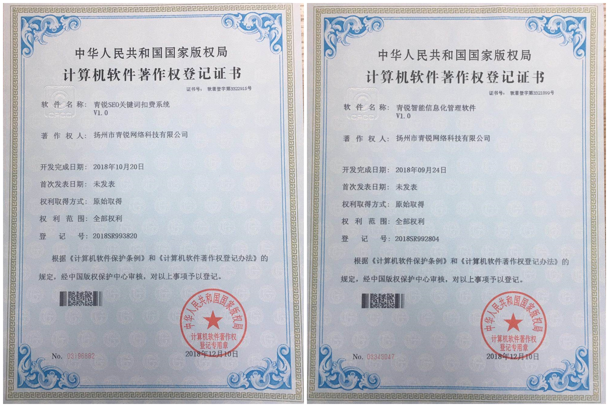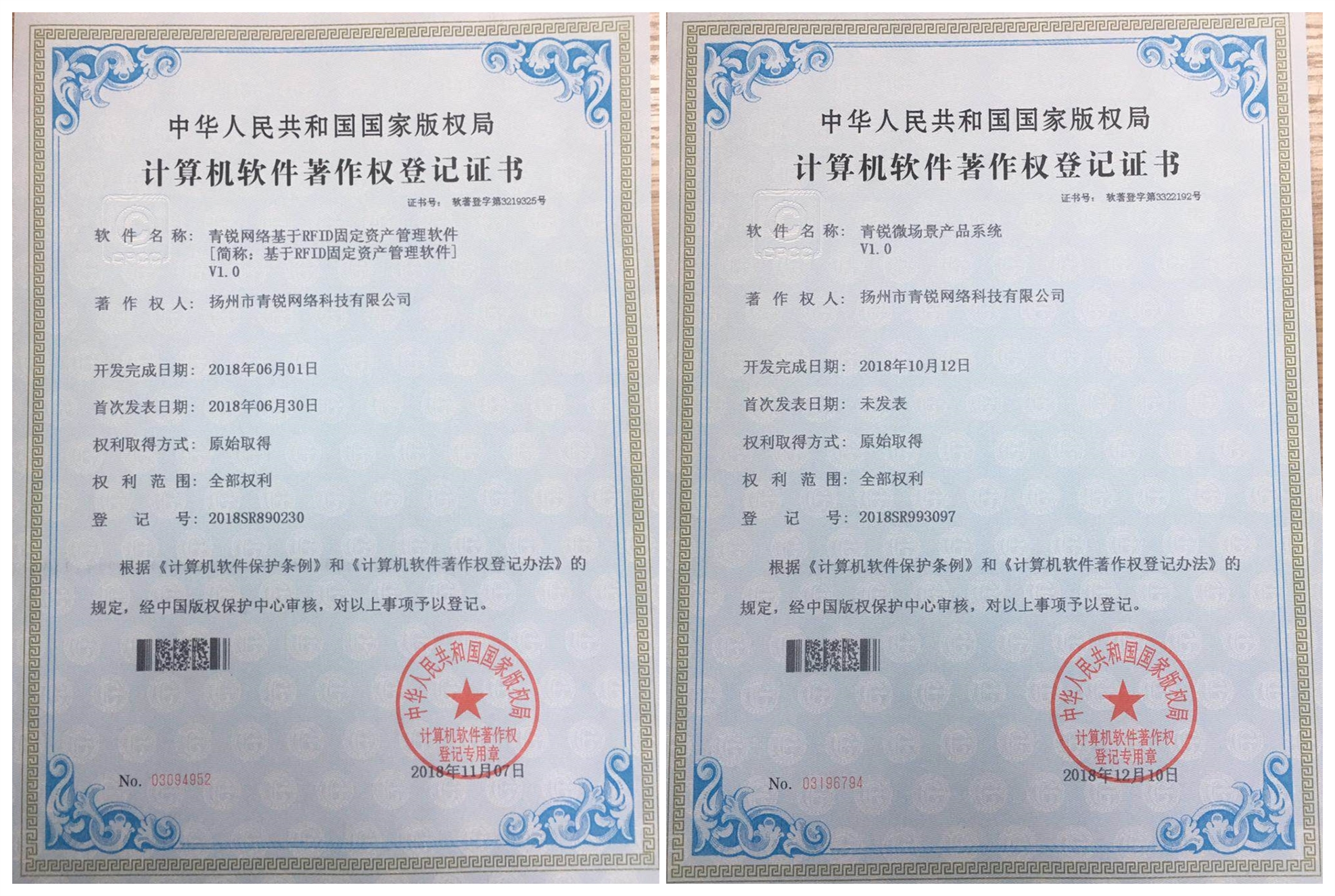 根據(jù)《計(jì)算機(jī)軟件保護(hù)條例》和《計(jì)算機(jī)軟件著作權(quán)登記辦法》規(guī)定,經(jīng)中國版權(quán)保護(hù)中心審核,揚(yáng)州市青銳網(wǎng)絡(luò)科技有限公司近期取得7項(xiàng)計(jì)算機(jī)軟件著作權(quán)