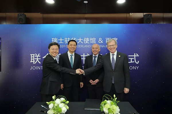 4月25日,百度與瑞士駐華大使館正式簽署聯(lián)合意向書,百度公司董事長兼 CEO 李彥宏與瑞士聯(lián)邦主席于利·毛雷爾共同見證: