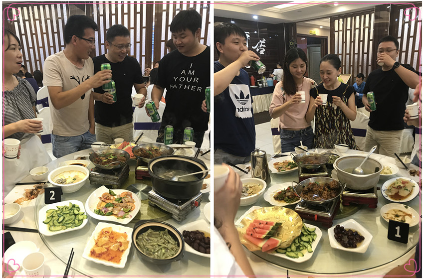結(jié)束一天的行程,大家的精力似乎源源不斷地更新,夜晚已來(lái)臨,也沒(méi)有任何倦意在大家的臉上浮現(xiàn),只有肚子在咕咕地抗議著,到達(dá)用餐的地點(diǎn),選定自己的座位,我們李總說(shuō)出來(lái)玩就需要盡興,今晚飯菜管夠,酒水管夠。酒也是一個(gè)很好的利器,中國(guó)的酒文化博大精深,非常感謝公司能有這樣一次機(jī)會(huì)讓大家心貼的更近,氣氛更加和諧,大家放下了在工作中的束縛,展現(xiàn)出了真的自我。