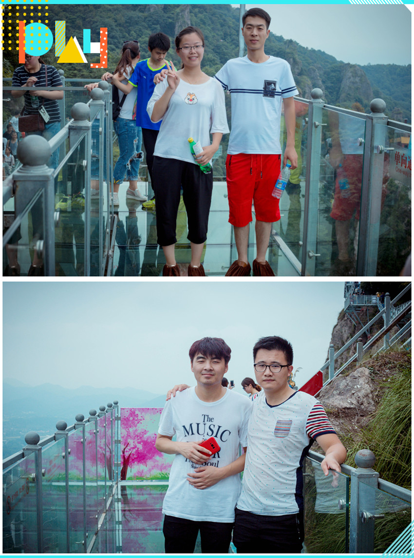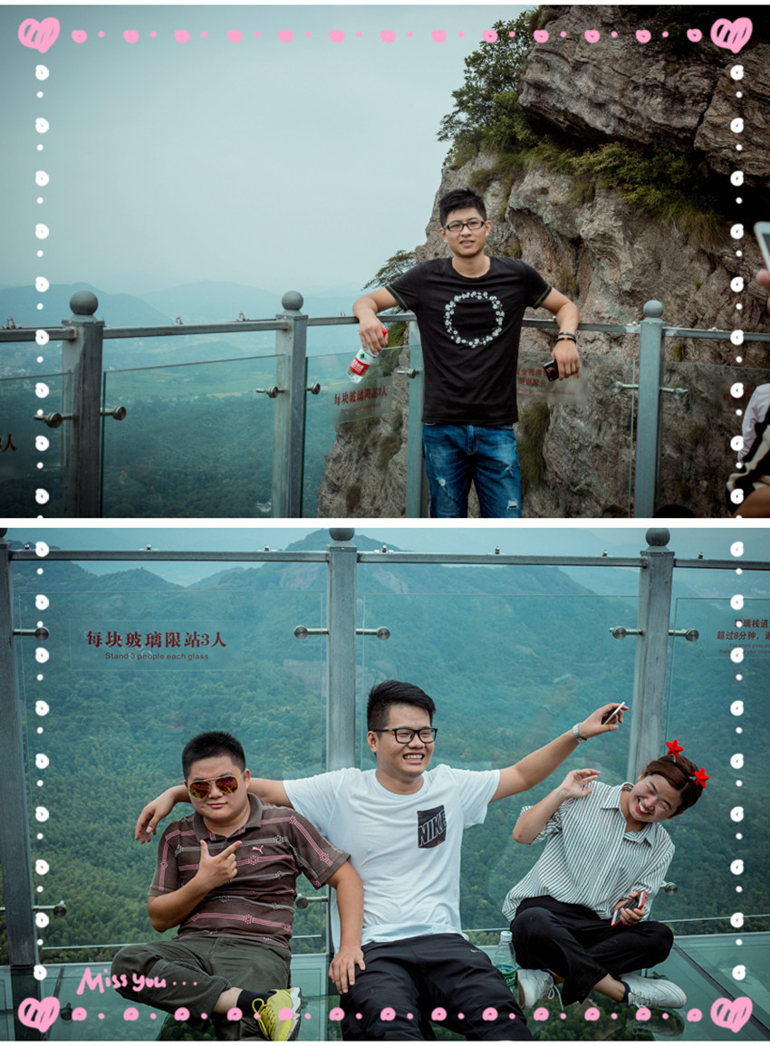 想要體驗(yàn)玻璃棧道的驚險(xiǎn),我們首先要通過(guò)自己的努力爬上山頂,這是一個(gè)相互協(xié)作的過(guò)程,山路的崎嶇,對(duì)于久坐辦公室的我們來(lái)說(shuō)是一個(gè)考驗(yàn),但我們的小伙伴是友愛(ài)的,不會(huì)落下一個(gè),不會(huì)拋下一個(gè),走不動(dòng)的時(shí)候,總會(huì)有加油吶喊聲在耳側(cè)傳來(lái)。辛苦只是過(guò)程,結(jié)果總是美好的,當(dāng)顫顫巍巍走到玻璃棧道入口時(shí),我們又是那么的開(kāi)心,因?yàn)槲覀兘K于得到了我們想要的結(jié)果。玻璃棧道上,小伙伴做著各種各樣的造型,證明自己來(lái)過(guò),展示著自己的強(qiáng)大內(nèi)心。